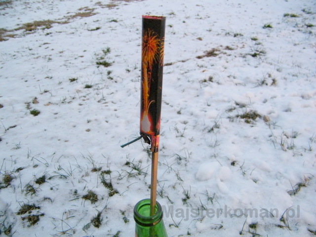 – zużyta rakieta, czarny proch, lont, kawałek patyka, klej, butelka