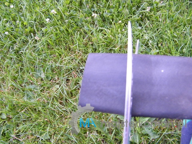 - Wytnij niewielką kilkucentymetrową owalną łatkę ze starej dętki i zmatowiej ją papierem ściernym. Zrób to samo z okolicami przedziurawionego miejsca, mniej więcej na szerokości łatki (oczywiście po osuszeniu).
