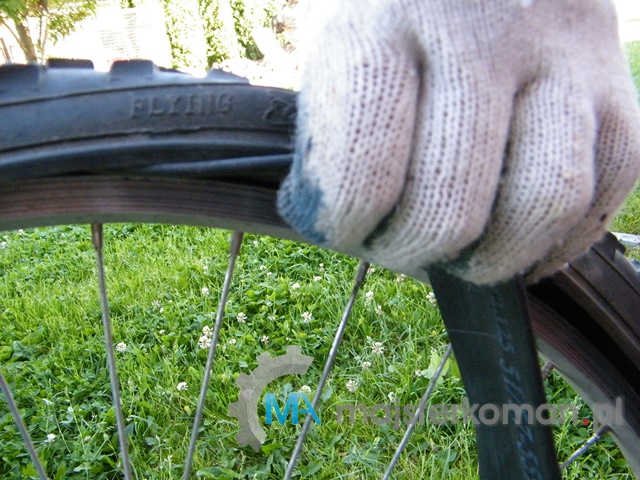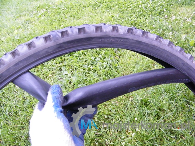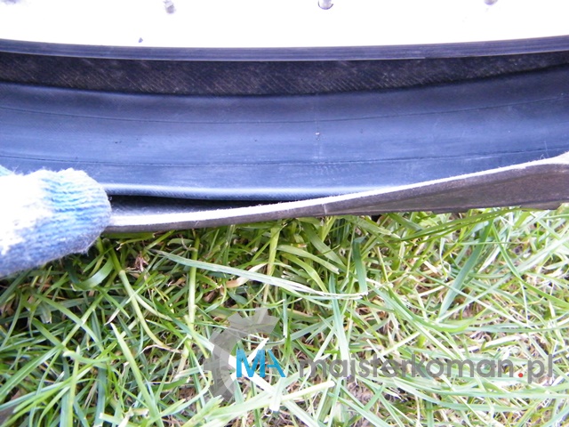 - Naciągnij jedną całą krawędź opony na rant, po czym ułóż wewnątrz dętkę.