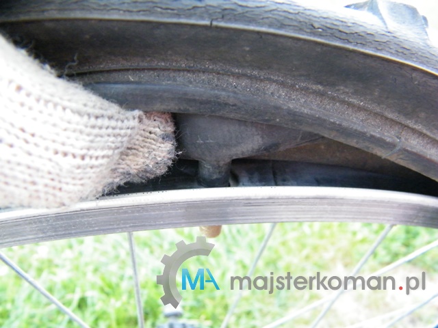 - Wykręć kapturek i zabezpieczenie wentyla (jeśli jest), wepchnij go do środka i zdejmij oponę zw. płaszczem wraz z dętką. Zrobisz to z łatwością ręką, bez używania kluczy.