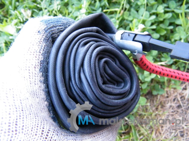 - Następnie spuść powietrze do końca. Dla ułatwienia wykręć zaworek, złóż dętkę na pół tak, by wentyl znalazł się na jednym jej końcu i poczynając od drugiego krańca zwiń całość. Powietrze zejdzie zupełnie, dzięki czemu łatwo umieścisz dętkę w oponie, którą należy dokładnie ułożyć, by uniknąć podwinięcia.