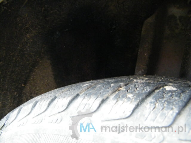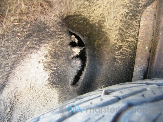 W razie potrzeby, przed przystąpieniem do pracy, zdejmij koło. Czasem wystarczy unieść karoserię podnośnikiem. Koło opadnie na tyle, by bez problemu dostać się do naprawianego miejsca, bez jego ściągania.