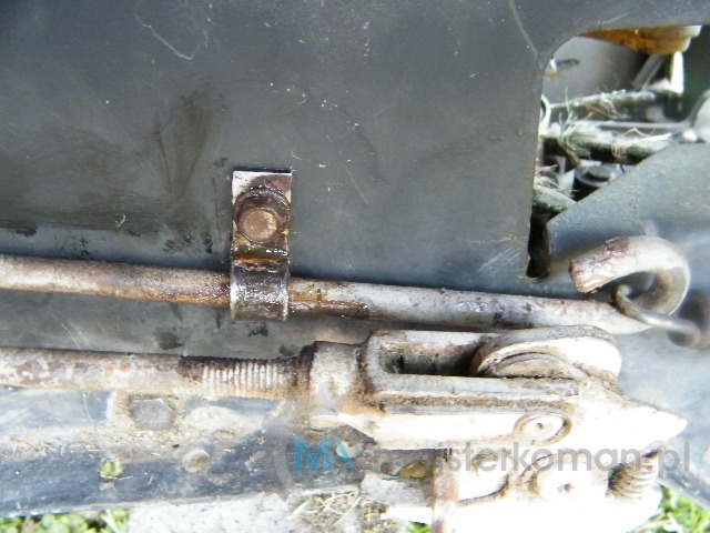 Cięgno dźwigni postoju czy inaczej funkcji parkingu zw. hamulcem traktora ogrodowego MTD osadzone jest między innymi w specjalnej obejmie. (No właśnie. Zastanawiałem się jak nazwać ten podzespół: wspornik, obejma, prowadnica…? W każdym razie, jak zwał tak zwał, chodzi przecie o jedno) 😉 Ma ona za zadanie utrzymanie w ryzach dźwignię, by ta nie kolidowała z elementami mechanizmu napędowego kosiarki. Niestety zastosowana cienka blacha może szybko się zużyć i przerwać, pozbawiając cięgno odpowiedniego podparcia. Zatem ową obejmę trzeba wymienić; ale czy jest sens kupować nową część? W tym krótkim poradniku chciałbym pokazać jak łatwo zrobić i wymienić taki wspornik, wykorzystując stary zawias do drzwi.
