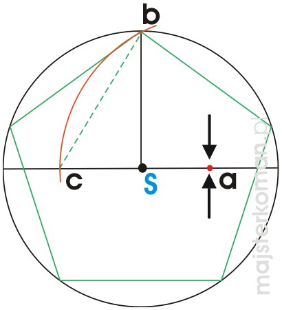 Narysuj okrąg i wyznacz średnicę. Od jej środka S poprowadź prostopadłą linię. Odmierz połowę promienia (innymi słowy ¼ średnicy), wyznaczając punkt a. Od tego punktu (tutaj wbij cyrkiel) wyrysuj krzywą, poczynając od punktu b i przecinając promień. Miejsce przecięcia wyznaczy punkt c. Odległość między punktem b i c jest długością boku pięciokąta.