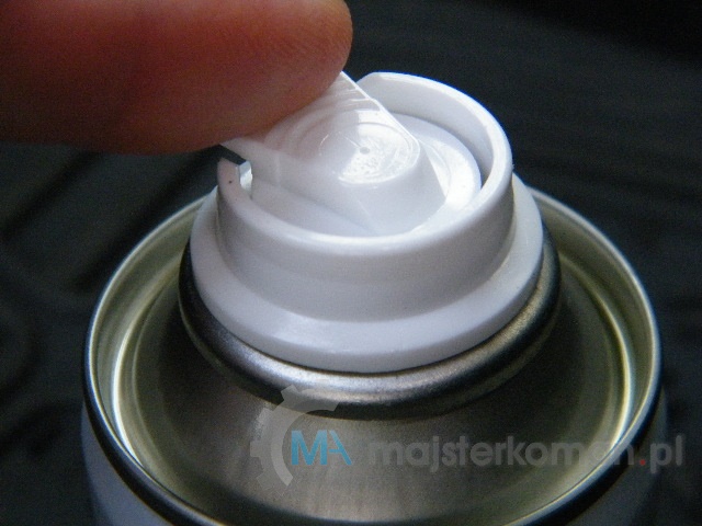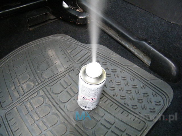 - Przed użyciem wstrząśnij pojemnik z preparatem odświeżającym, postaw go zaworem do góry na podłodze za przesuniętym fotelem i mocno wciśnij zawór puszki z aerozolem do momentu blokady, aż środek zacznie się wydobywać.