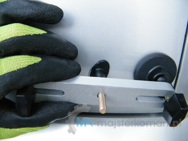 - Załóż mostek wyciągający na stopkę i powolnym ruchem kręć pokrętłem aż do momentu zerwania łączenia.