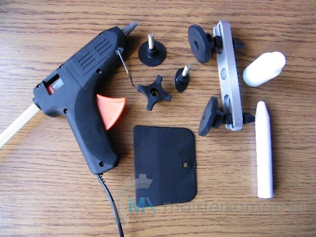 – zestaw naprawczy do usuwania wgnieceń karoserii (wraz z pistoletem do kleju, klejem, środkiem odłuszczającym, itd.), suszarka lub opalarka, szmatka