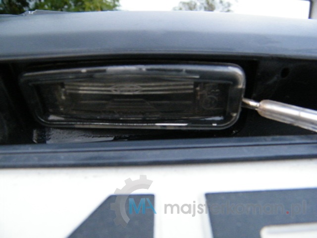 - Dla wygody podnieś klapę bagażnika i podważ wkrętakiem z jednej strony obudowę oświetlenia.