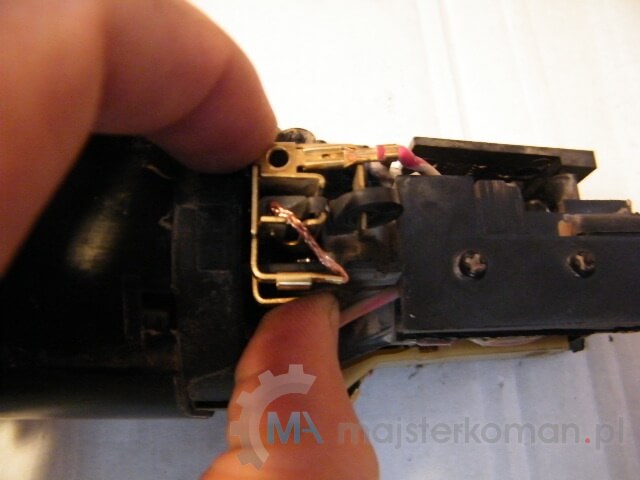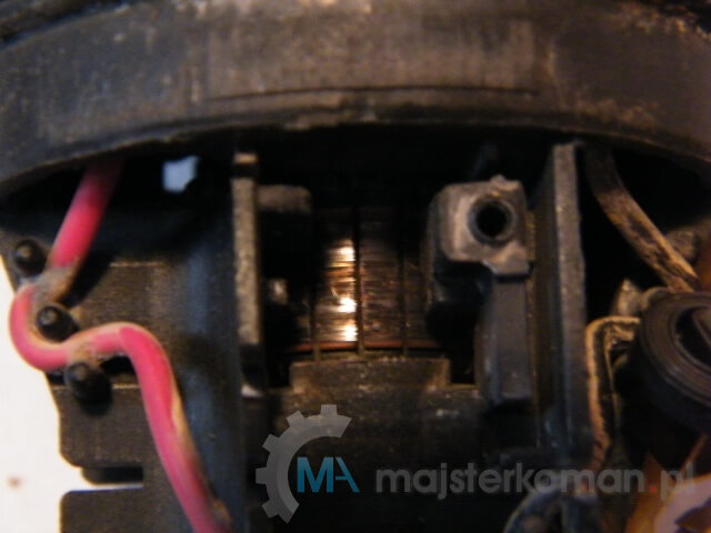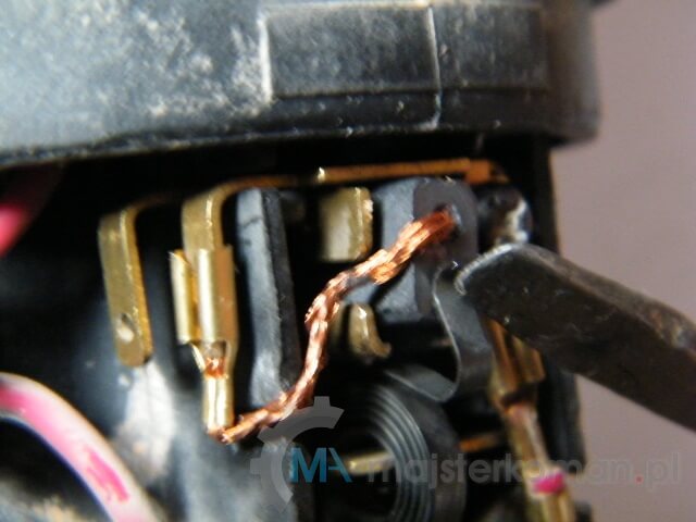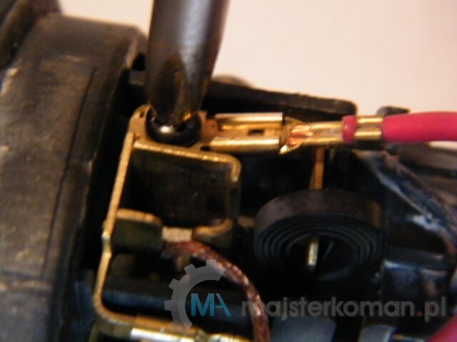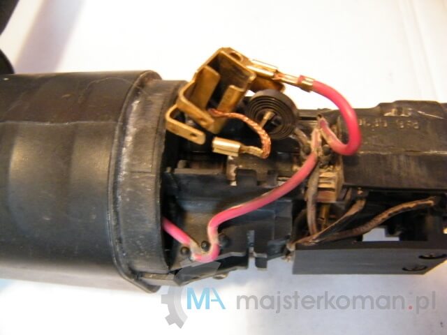 Przy wyjęciu sprawdza się płaski wkrętak, przynajmniej w początkowej fazie - Wypinam kabelki doprowadzające prąd i wyjmuję zużyte szczotki.