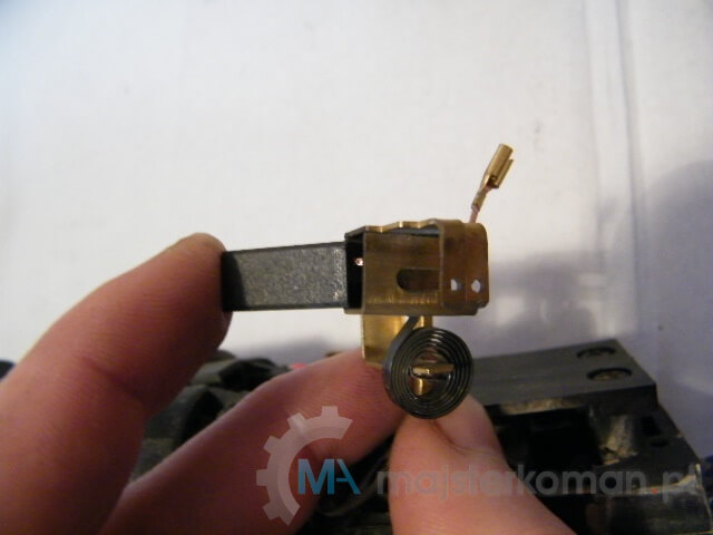 Zużyta szczotka szlifierki - Nowe szczotki wkładam od spodu. Zwracam uwagę, aby sprężynki dociskowe były odpowiednio umiejscowione.