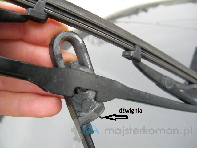 - Podnieś ramię wycieraczki, naciśnij dźwignię zaczepu i wysuń wycieraczkę.