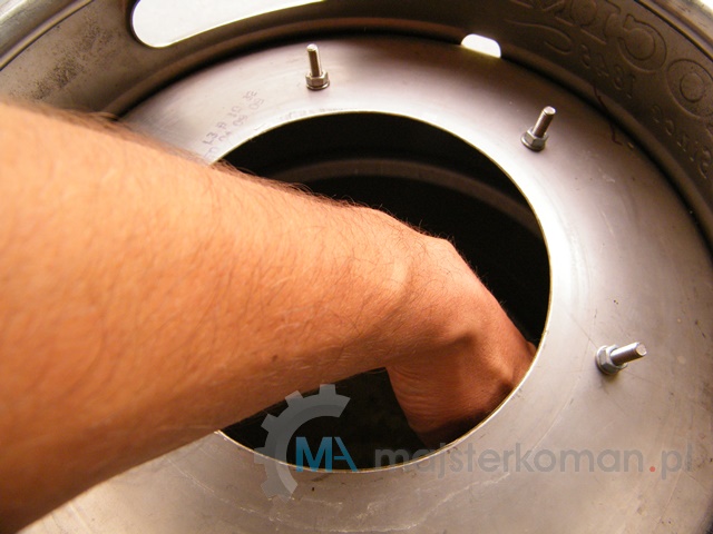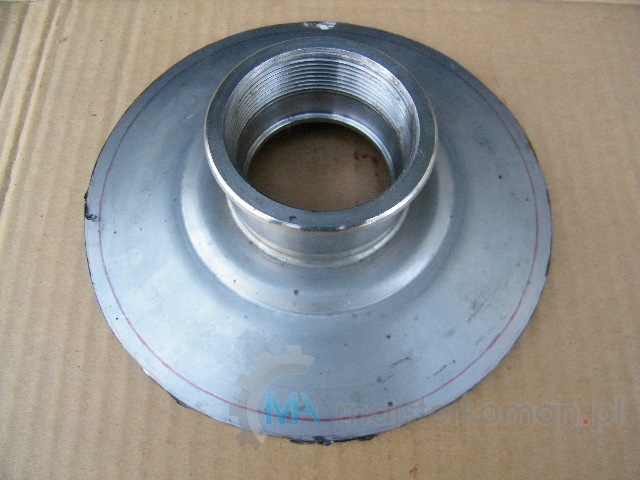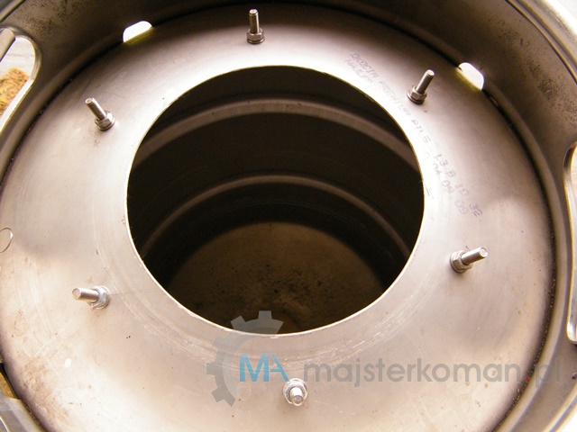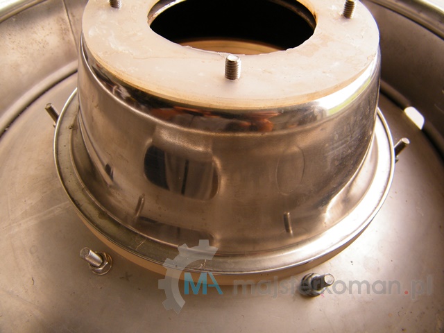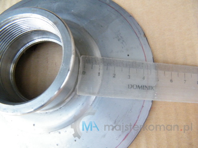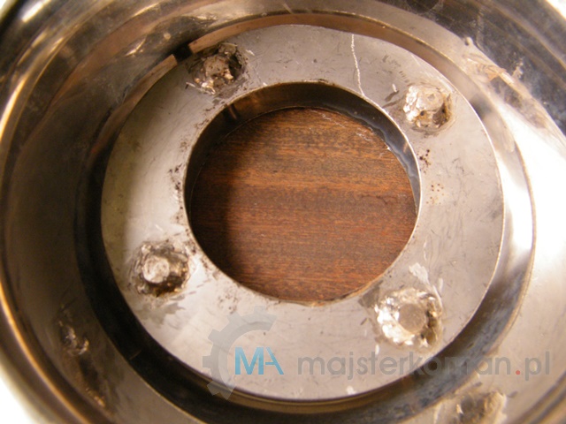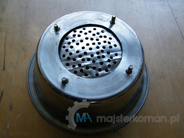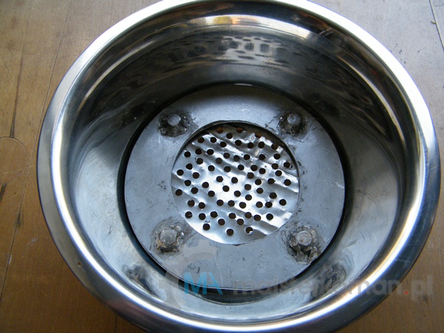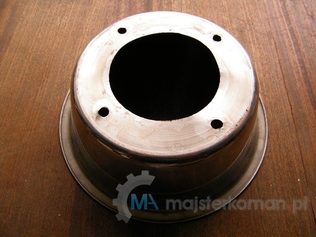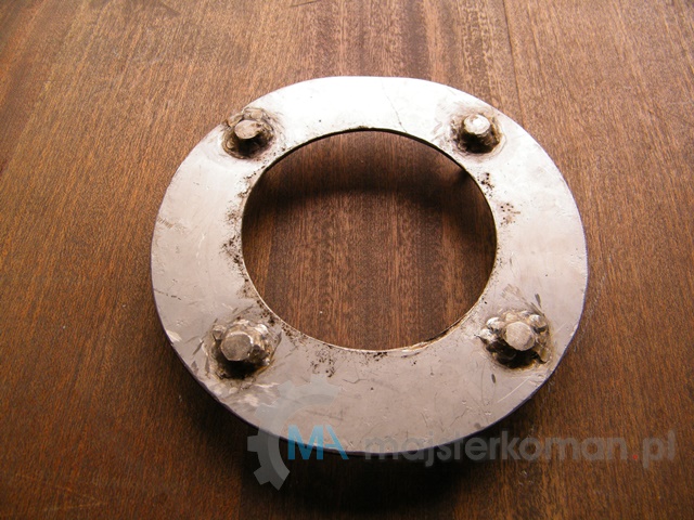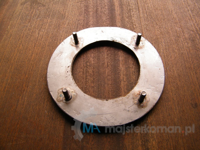 Miska z wyciętym otworem w dnie - Jako że blacha miski jest bardzo cienka, należy wykonać podkładkę wzmacniająca z grubszej stali. Powinna mieć średnicę podstawy miski i taki sam rozstaw śrub, które można zespawać.
