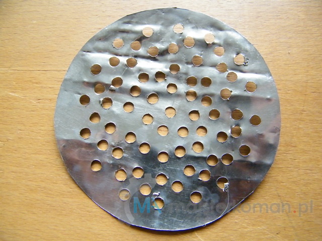 Druga strona podkładki - Aby zapobiec wypadaniu wypełnienia kolumny, można od razu dorobić sitko z cienkiej blachy, które winno mieścić się pośród śrub podkładki. Usadowienie sitka pomiędzy podkładką a dnem miski zapewnia odpowiednią stabilizację.