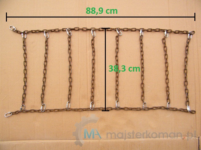 – 9 m łańcucha o grubości 4 mm, 36 ogniw zakręcanych gr. 3 mm, gumka ściągająca, 2 karabińczyki