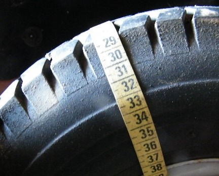 - Kolejną czynnością jest wykonanie pomiaru na krótsze elementy, mające bezpośredni kontakt z podłożem (8 sztuk na koło). Tutaj przydaje się miarka krawiecka, którą mierzę oponę (punkty pomiaru jak wyżej, tj. ok. 3 cm od rantu felgi) wychodzi 37 cm.