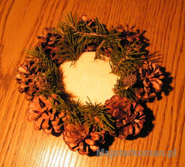- Poskracaj świerkowe gałązeczki i przytwierdź klejem pomiędzy szyszki. (powbijaj do gąbki każdą z nich pomiędzy szyszki). Ułatwisz sobie zadanie wspomagając się wykałaczką bądź zaostrzoną zapałką, którą zrobisz wstępne dziurki.