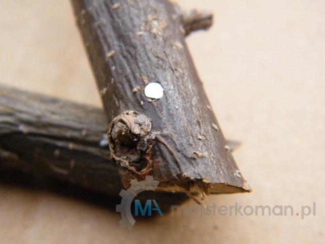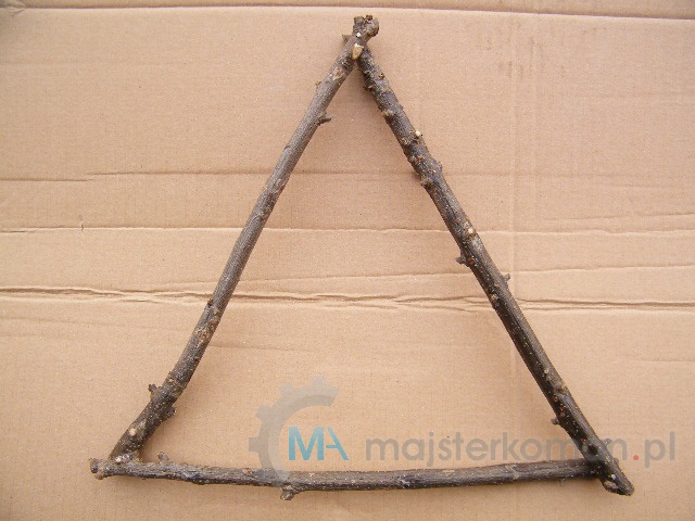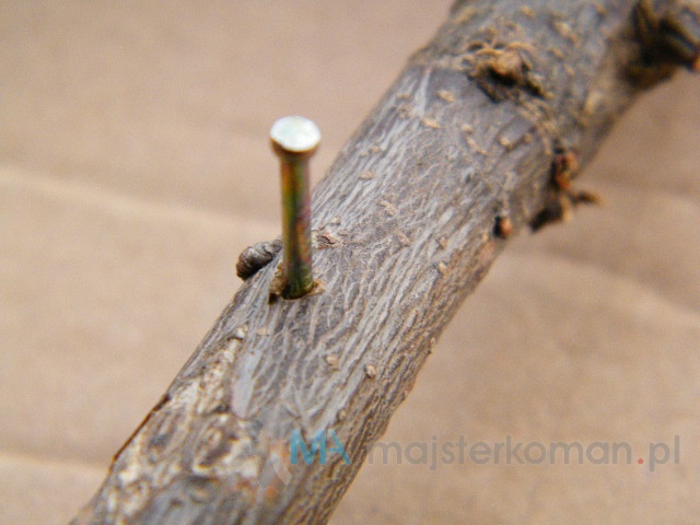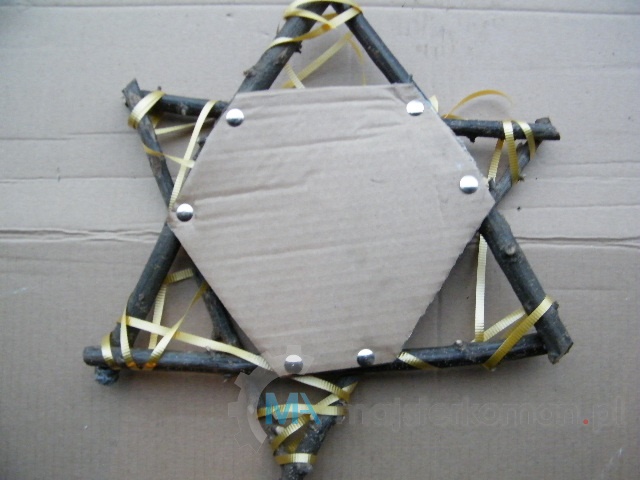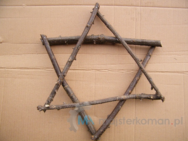 - Przytnij gałązki o tej samej długości i wykonaj z nich gwiazdę sześcioramienną. Połącz patyki za pomocą gwoździków naprzemiennie, tj. końce gałązek na zasadzie góra-dół (można wcześniej dodać między łączenia niewielką ilość kleju do drewna). Dla wygody wbij wcześniej gwóźdź na całą grubość patyka, a potem dobij resztę w w drugą gałązkę. Najlepiej jest wykonać dwie części gwiazdy, a następnie je połączyć.