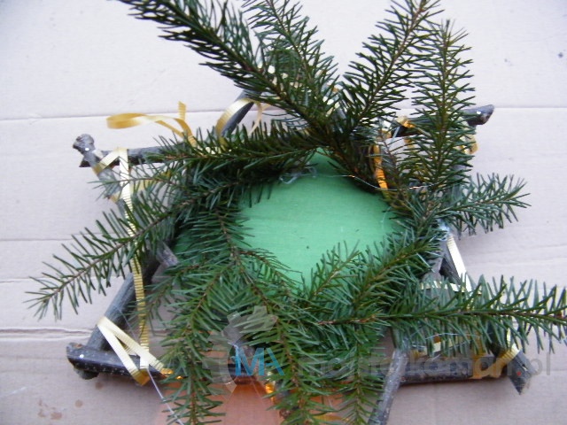 - Następnie doklej do gwiazdy świerkowe gałązki.