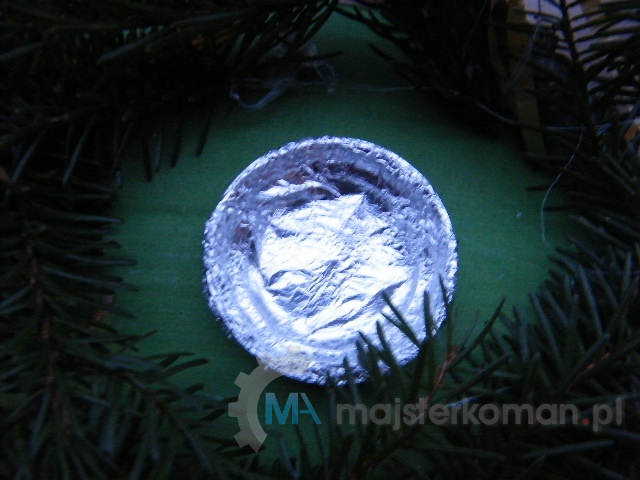 - Przyklej po środku podstawkę na świeczkę. Jeśli nie masz gotowej można wykonać ją, np. z nakrętki od wody mineralnej. Dla estetyki wystarczy nanieść nieco kleju na denko i obłożyć ją folią aluminiową, tak aby dokładnie przylegała do plastikowej powierzchni.