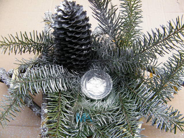 - Doklej obok szyszkę i spryskaj ją farbą oraz świerkowe gałązki.