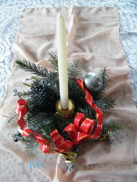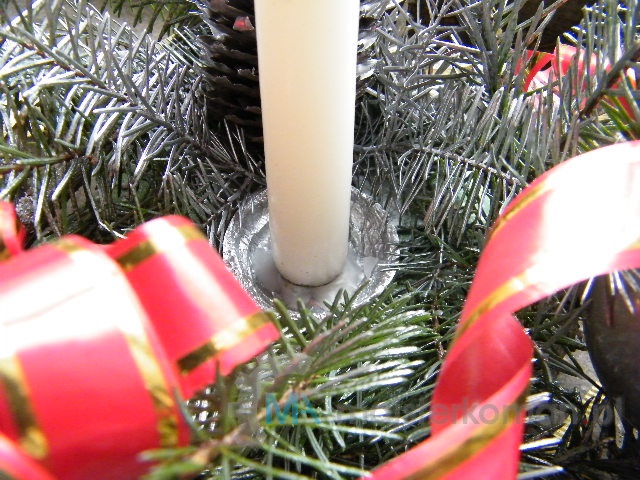 – dębowe gałązki, wstążka dekoracyjna, tektura, bombka, szyszka, świerkowe gałązki, kokardka, świeca, podstawka, sztuczny śnieg, klej na gorąco, pistolet do kleju, gwoździki, pinezki, srebrna farba w spreju, młotek, sekator lub nóż