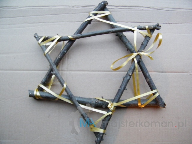 Jeden z trójkątów gwiezdnego stroika - Owiń gwiazdę wstążką (wystarczy kilka zwojów na ramię).