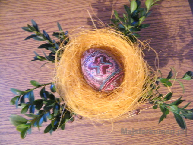 - Z sizalu lub sianka (bardziej ekologicznie i bardziej zapachowo ;)) uformuj gniazdko, włóż do koszyczka i umieść w nim jajeczko.
