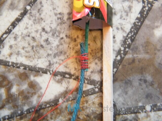 - Przygotuj rakiety. W tym celu przytnij odpowiedniej długości lonty (5 – 7 cm powinno wystarczyć) i zwiąż nicią każdy z nich z zamocowanymi odcinkami w rakietach.