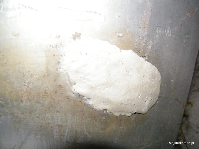 - Kiedy przestaje już cieknąć z nieszczęsnej dziury można przerwać wylewanie wody. Wytrzyj szmatką do sucha reperowane miejsce i przetrzyj papierem ściernym, tak aby pozbyć się rdzy, brudu i zacieków.